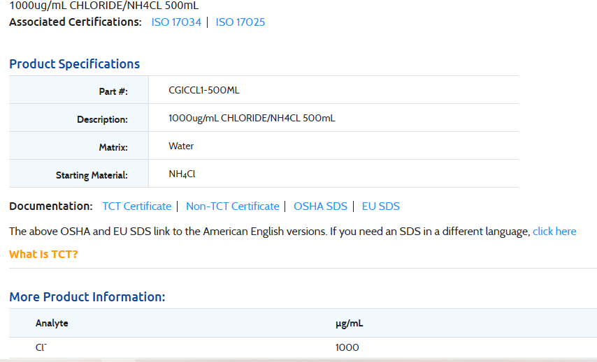 1000ug/mL CHLORIDE/NH4CL 500mL-INORGANIC VENTURES, CGICCL1 (INC IGV) Stock Stock por sucursal US$ 160.00 cantidad Agregar al carro Encargar