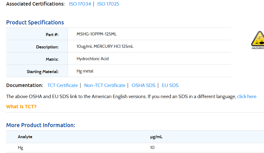 10ug/mL MERCURY HCl 125mL-INORGANIC VENTURES,MSHG-10PPM-125ML (INC IGV) Stock Stock por sucursal US$ 100.00 cantidad Agregar al carro Encargar