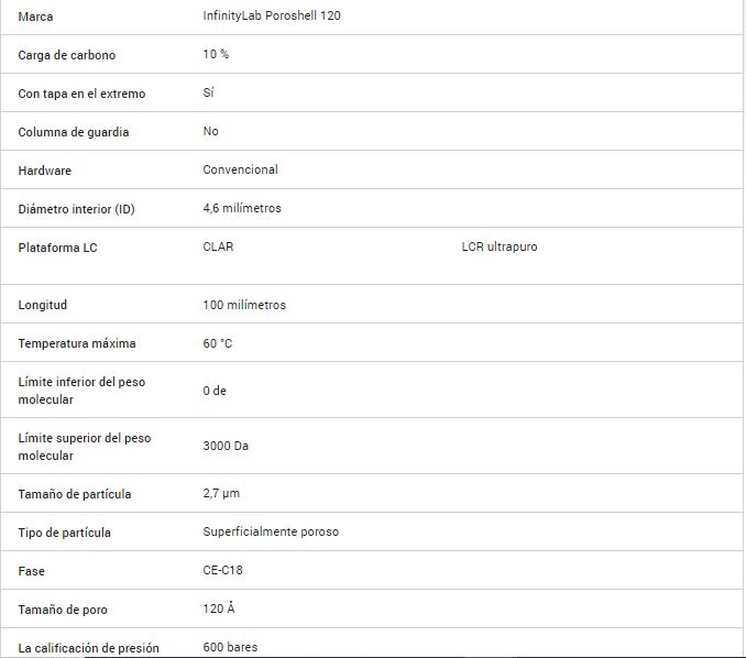 InfinityLab Poroshell 120 EC-C18 4,6 x 100 mm, 2,7 um (INC IGV) Agilent Technologies Stock Stock por sucursal US$ 0.00 cantidad Agregar al carro Encargar