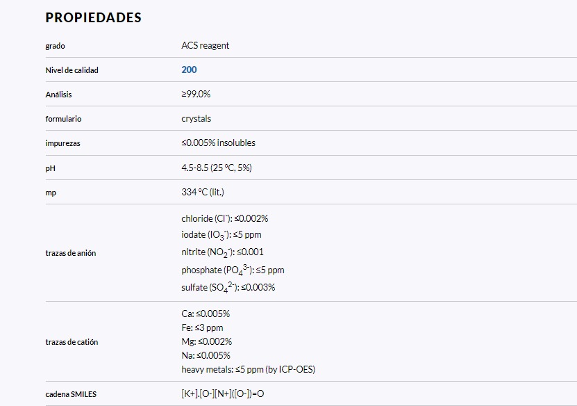 Potassium nitrate 100gr (INC IGV) Sigma Aldrich Stock Stock por sucursal US$ 155.00 cantidad Agregar al carro Encargar